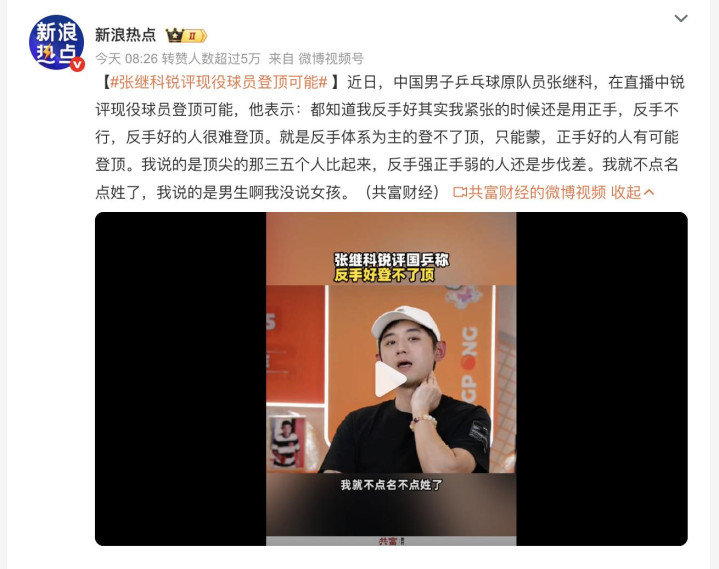 在赛后,很多球迷都为国乒的球员感到可惜,与此同时也在追问,目前国乒球员在打法方面到底出现了什么问题?就在日前,国乒大满贯张继科在他的直播当中透露了自己的一些想法,锐评现役球员登顶的可能性。从中我们知道,目前有些年轻球员在打法方面可能确实遇到了一些挑战。